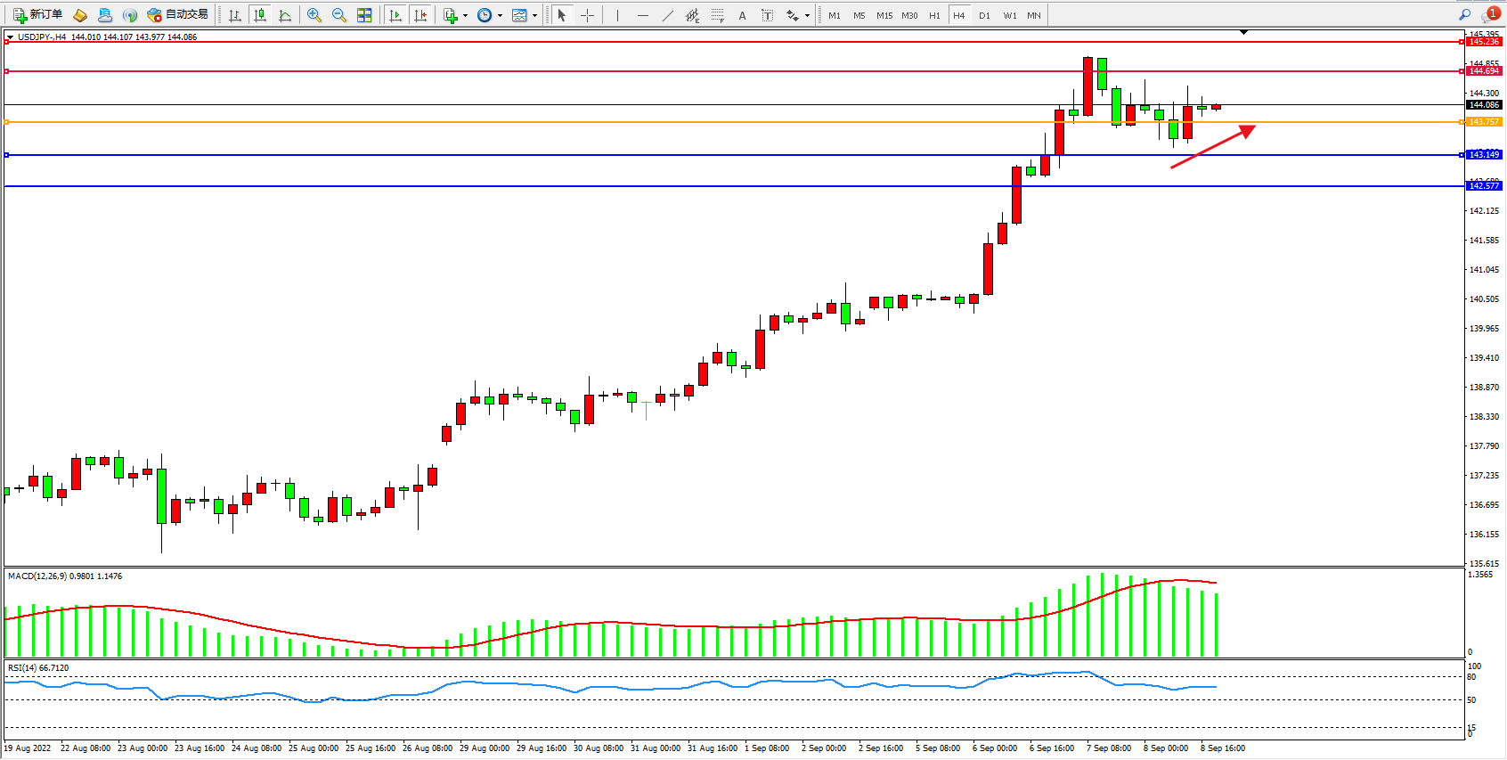 美元日圆USDJPY——4小时K线图显示: