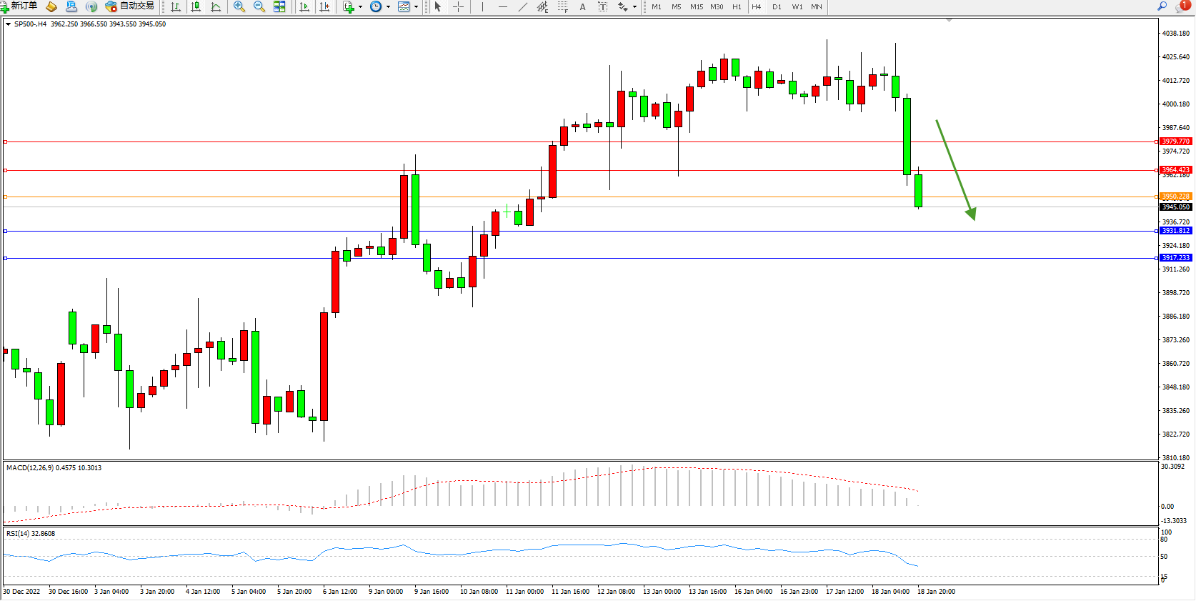 标普500指数1月18日(周三)收盘下跌61.97点,跌幅1.55%,报3929.00点;在假日购物季结束之际,美国零售额降幅超过预期,因为消费者面临着数十年来以来最严重的通胀和更高的借贷成本。美国12月零售销售月率下降1.1%,此前一个月的数据向下修正为-1%。核心零售销售下降了0.7%。
