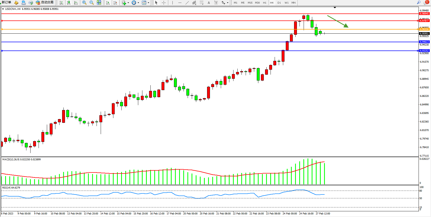 备选策略:6.96556上方看涨,目标6.97877、6.98945