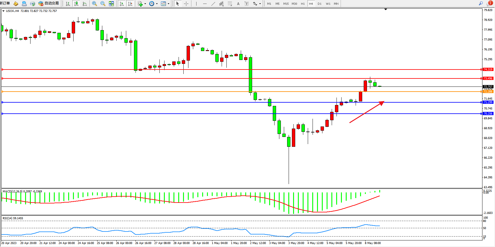 交易策略:72.288上方看涨,目标73.496 74.319