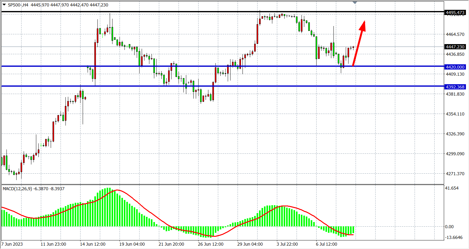 4小时图看,标普在4420附近止跌反弹,MACD量能维持零轴之下,反弹动能表现较强,上方阻力4460-4490,下方支撑4420-4390。