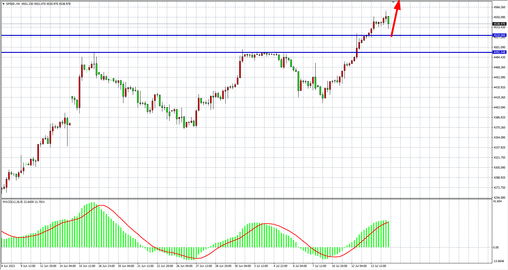 4小时图看,标普涨至4460一线出现回落,MACD量能在零轴上持续放量,趋势延续上涨格局不变,当前支撑关注4490-4520,上方阻力4580-4630。