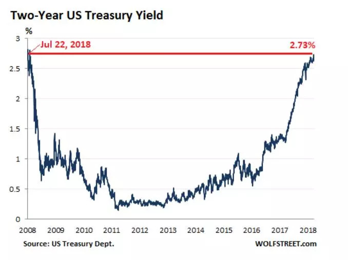 两年期美债收益率在9月10日收盘时为2.73%,是2008年7月22日以来最高。